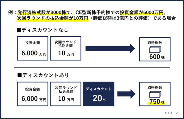 20%のディスカウントレートが設定されている場合(払込金額の80%である8万円が転換価額となる場合)には、6000万円÷8万円=750株となり、CE型新株予約権で投資した投資家は、750株を取得できることになります。