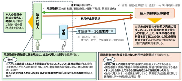 具体的には、改正法では、年齢基準を16歳未満としたうえで、例えば、個人データの第三者提供の際の本人の同意については、本人が16歳未満の子供である場合には、当該子供の同意を得られればよいということではなく、法定代理人(親権者)の同意を得ることが必要となります。