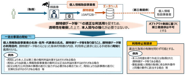 そこで、改正法では、顔特徴データ等を取り扱う事業者に対して、その取扱いに関する一定の事項の周知を義務付け、本人からの利用停止等請求の要件を緩和するとともに、オプトアウト制度に基づく第三者提供が禁止されることになりました。