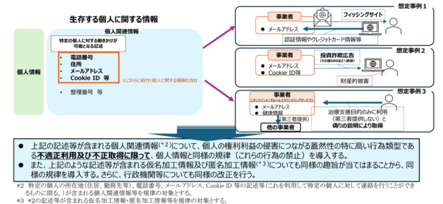 そこで、改正法では、上記の記述等が含まれる個人関連情報[5]について、個人の権利利益の侵害につながる蓋然性の高い行為類型である不適正利用及び不正取得に限って、個人情報と同様の規律(これらの行為の禁止)が規定されることになりました。
