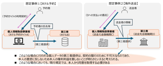 例えば、以下のような事例における個人データの第三者提供は、契約の履行のために不可欠なものであり、本人の意思に反しないため本人の権利利益を害しないことが明らかであるといえます。